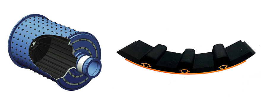 棒磨機(jī)是由筒體內(nèi)所裝載研磨介質(zhì)為鋼棒而得名,因兩端鋼棒經(jīng)過研磨后銳利,故此類設(shè)備所采用樟膠襯板主要包括:筒體橡膠襯板部分及配套緊固件,具有低噪音、抗沖擊、耐腐蝕、易更換等優(yōu)點(diǎn)。